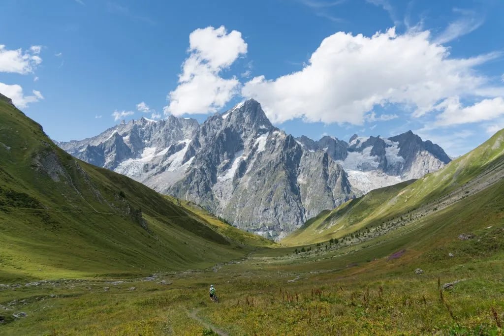 Optando por el camino escénico a la derecha del valle, los excursionistas disfrutan de magníficas vistas del Monte Bianco, que se extienden hasta el Col de la Siegne del día anterior. El sendero luego desciende a las pistas de esquí de Maison Vieille, seguido de un empinado descenso a Courmayeur, el contraparte italiano de Chamonix. Hay un teleférico disponible para aquellos que deseen ahorrar sus rodillas.
